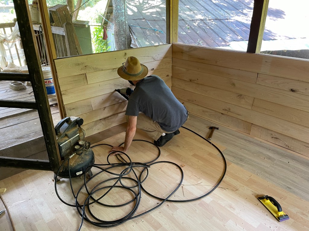 So, as we looked around, and had these conversations, the words of “we could have a school here” came to the forefront. We started dreaming up what the playground would look like and what work we would have to do to make it possible. We shared our idea with Paul and Terra and began working with them to put our idea into action. I had my doubts, it was a big undertaking and commitment on something we had no guarantee for. This endeavor is something I never would have or could have done on my own. With the support of Camden, Paul, and Terra, the space started to take shape. We began by building a fence around the playground which for several months would hold two goats, Truffles and Nugget, who also contributed greatly to the project by eating all the rapidly growing kudzu and weeds. Clearing space, moving the play set, laying down wood chips, building a sandbox, installing a ceiling fan, building a wall, changing a door knob, acquiring children sized furniture and toys, cleaning, painting, putting in a floor and a sink… this list goes on! Almost everything on this list, I had never done before. It took several months, but the space began to feel different, it felt ready to welcome children.